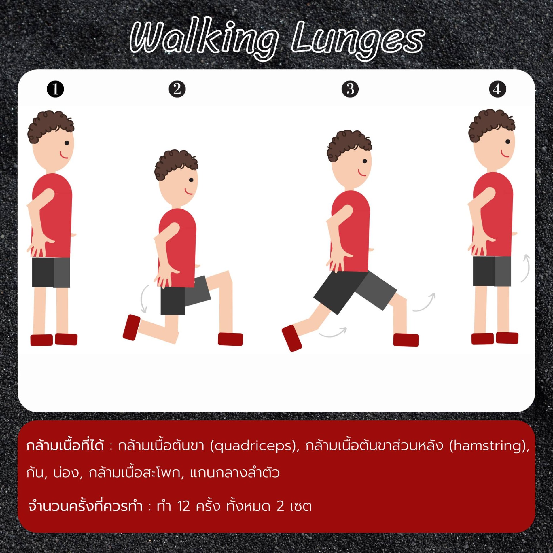 - ก้าวขาขวาไปด้านหน้า ไม่ยาวหรือสั้นจนเกินไป เข่าทำมุม 90 องศากับพื้น