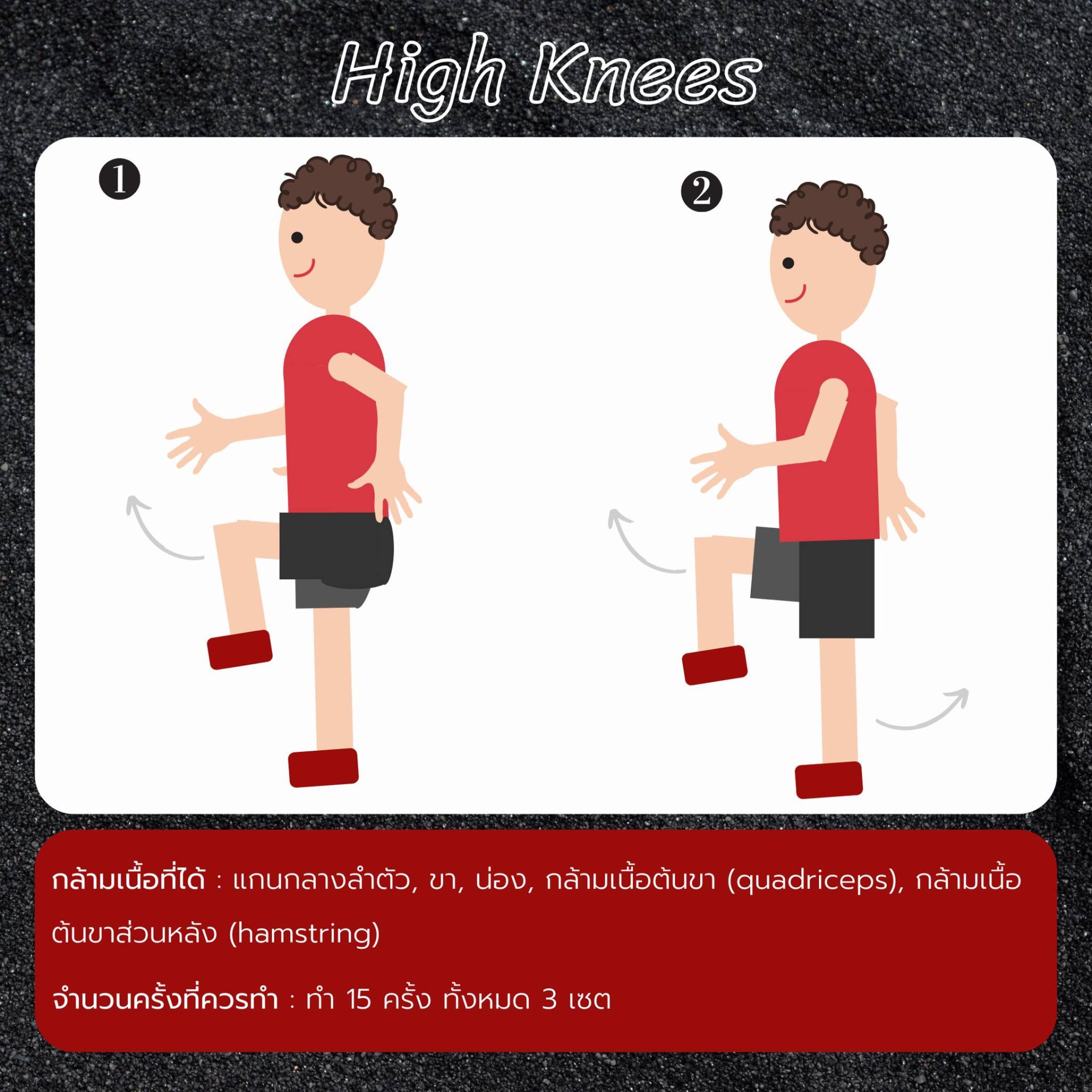 - วิ่งอยู่กับที่ โดยพยายามยกเข่าสูงให้แตะมือที่ยื่นออกมา