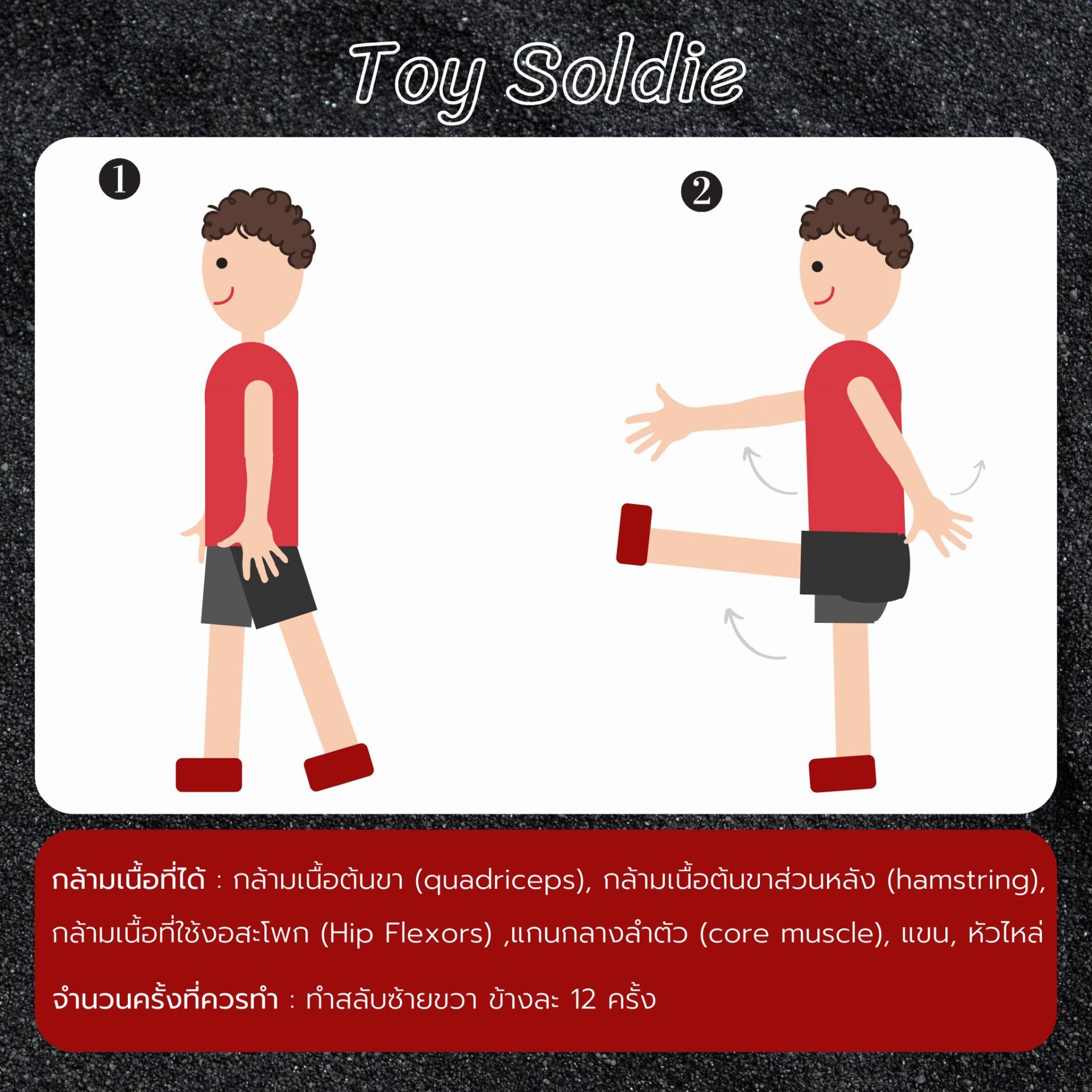 - ยื่นแขนซ้ายไปข้างหน้า ให้เท้าขวาแตะกับมือซ้าย เกร็งนิ้วโป้งไว้