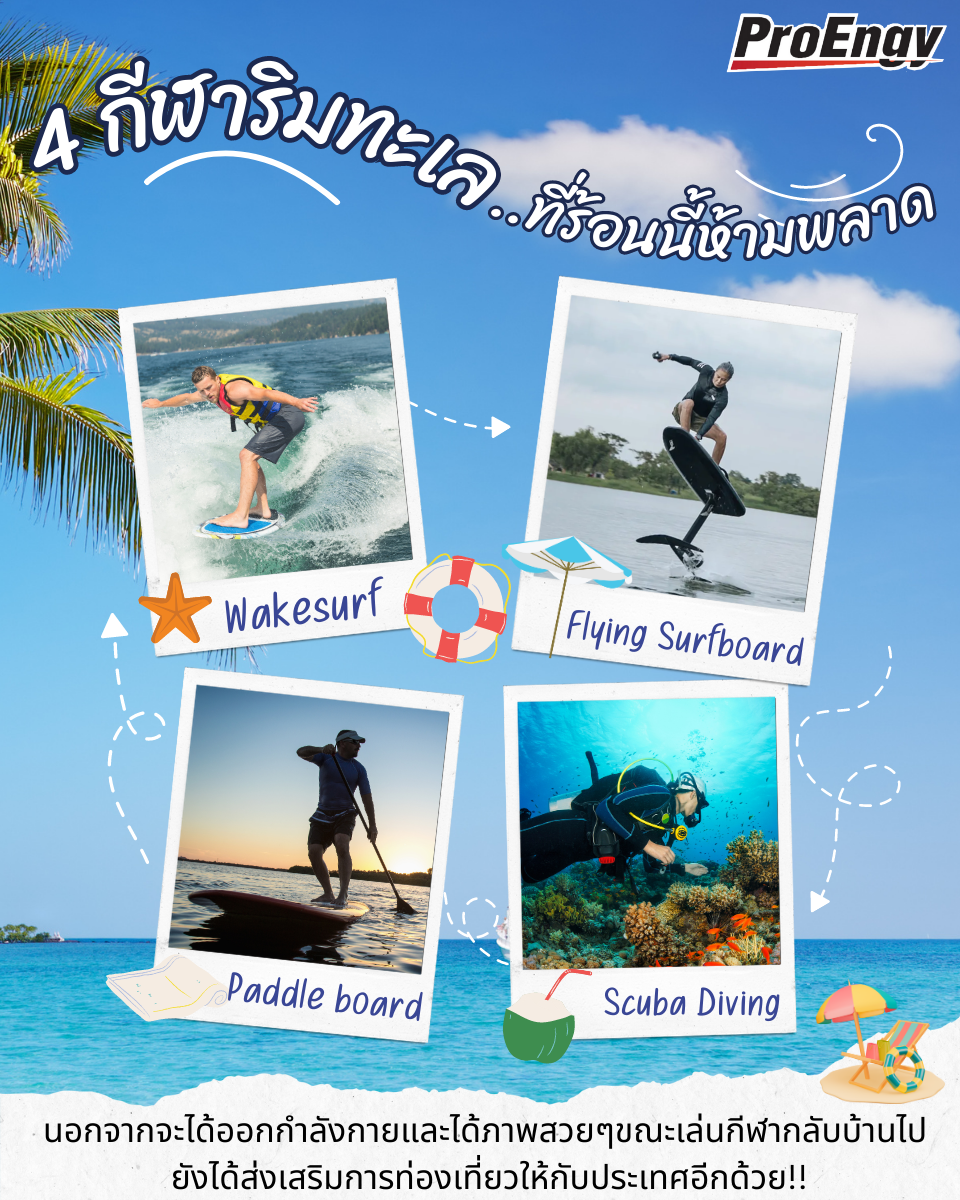 Flying Surfboard - เป็นกีฬาน้องใหม่ที่ยังเห็นได้น้อยในไทย จำเป็นจะต้องมีสมาธิเพื่อที่จะไปโฟกัสการทรงตัว เมื่อยืนอยู่บนบอร์ด ลักษณะพิเศษที่เห็นได้ชัดๆ เลยนั่นก็คือตัวบอร์ดจะลอยขึ้นเหนือน้ำ และใช้ อิเล็กทรอนิกส์เป็นที่ขับเคลื่อนไปด้านหน้า